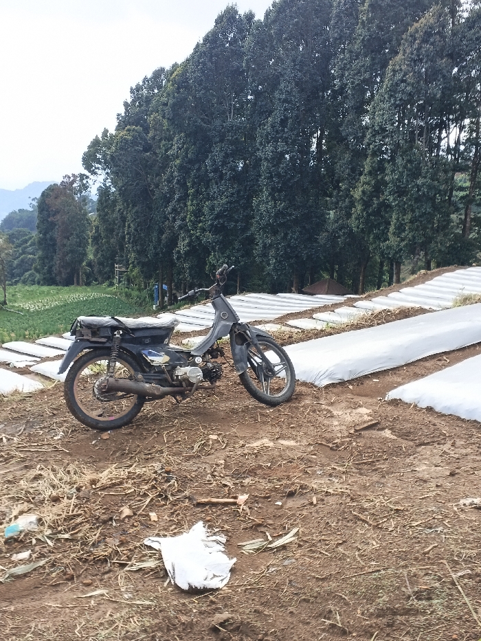 A motorbike is parked on a dirt patch overlooking farmland covered in white plastic. Rows of crops extend towards tall, dense trees bordering the field. Mountains are visible in the distance. Litter is scattered on the ground near the motorbike. The overcast sky suggests a rural, possibly mountainous region.