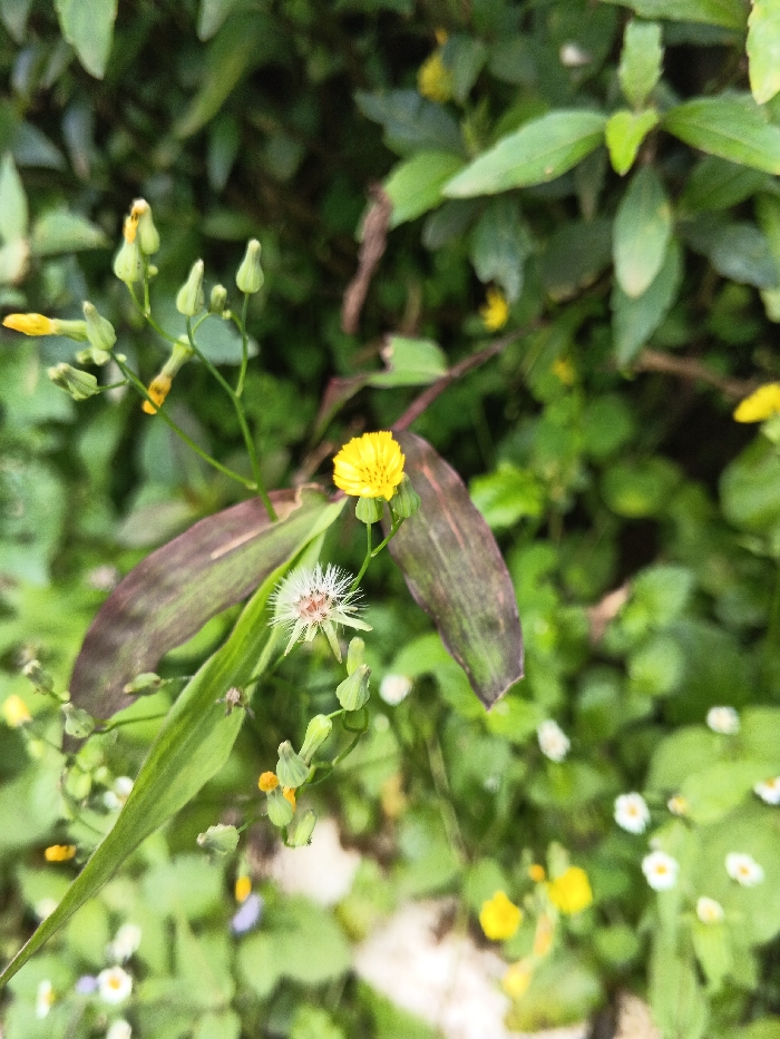 The image displays a close-up shot of a wild, untamed garden. In the foreground, a vivid yellow flower stands out, contrasted by a nearby white, dandelion-like seed head. Several other buds, both open and closed, dot the scene with yellow highlights. Deep green foliage and reddish-purple leaves create a dense backdrop, while a scattering of tiny white flowers further enlivens the garden floor. The overall impression is one of vibrant, natural growth.