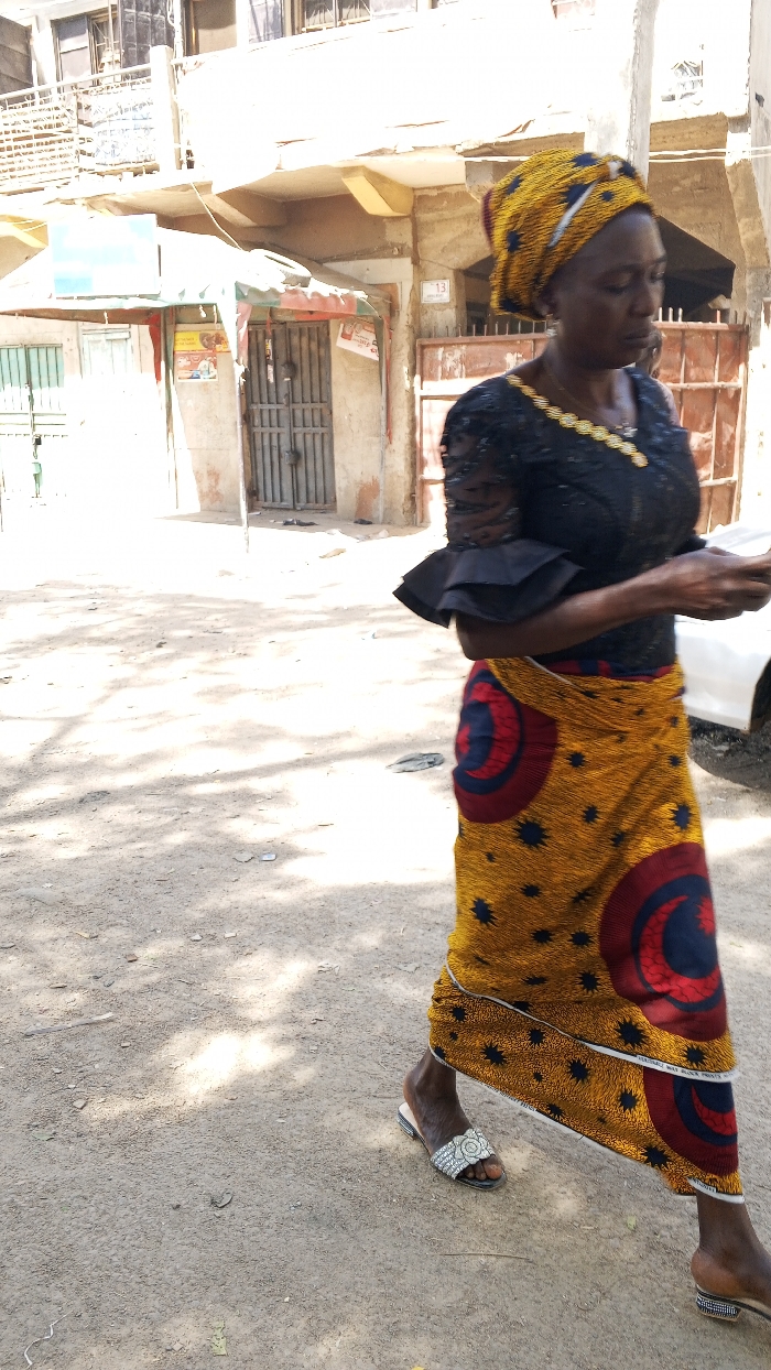 The image depicts an outdoor street scene in Sabon Gari East, Nigeria. A woman, observed mid-stride, walks from right to left across an unpaved, light brown dirt surface under bright daylight, indicated by strong shadows. She wears a yellow and dark patterned headwrap, a black short-sleeved top with lace texture and ruffled cuffs, and a long yellow skirt patterned with red and blue concentric circles and dark star-like shapes. Her feet are covered by decorative white and silver open-toed slides. She holds a small, white, rectangular object in her right hand. In the background, several multi-story concrete buildings are visible. A central structure features a green-striped awning over a double metal gate. A faded white sign displaying the number "13" is affixed to the wall to the right of this structure. A partial view of a white vehicle is present on the far right edge of the frame. The ground shows scattered debris.