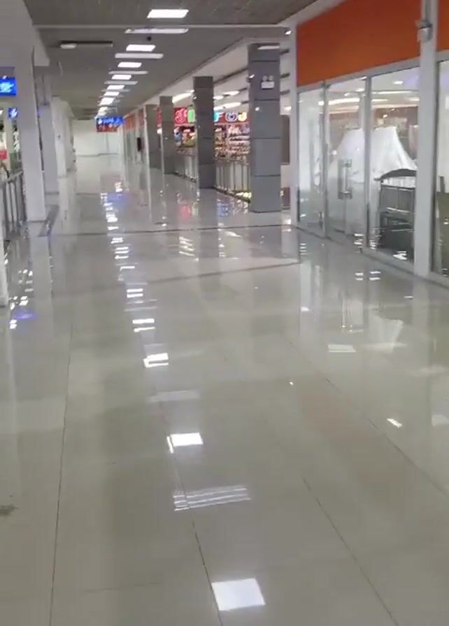 interior of a commercial space, likely a shopping mall, from a low angle. The floor is tiled and reflective, showing the reflection of the overhead lighting fixtures. The ceiling is a grid pattern with recessed lighting. The corridor is lined with storefronts, some with glass displays. The stores appear closed or empty. The overall impression is of a clean, modern, and somewhat deserted space. No people are visible.