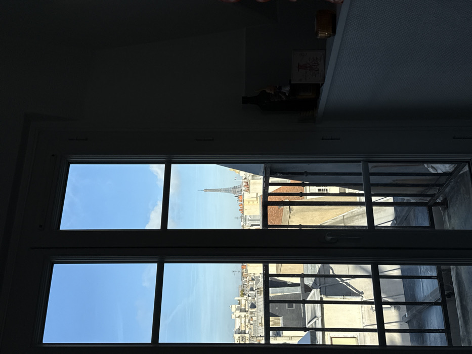 The image displays an exterior view of Paris, France, from an interior vantage point through a white-framed French door