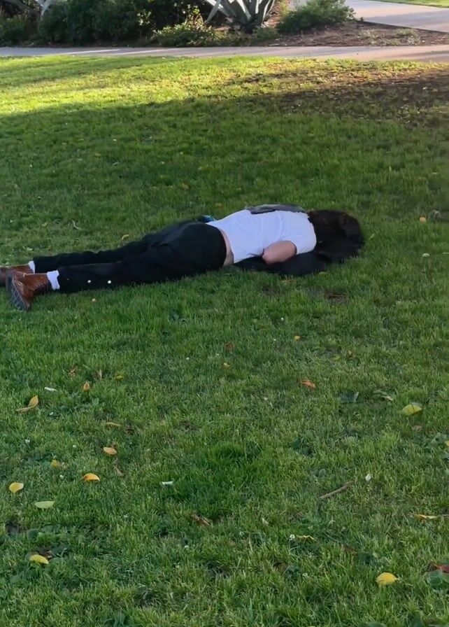 A person lies prone on green grass in a park-like setting. The individual is wearing a white t-shirt, dark pants, and brown shoes. Their head is turned to the side, partially obscured by dark, wavy hair. The grass is interspersed with scattered yellow leaves. Background vegetation includes trees and agave plants.