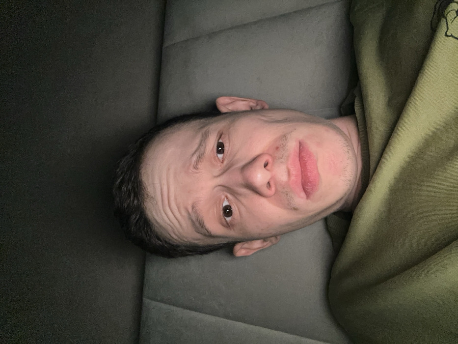 This image captures a close-up, eye-level perspective of an adult male. The scene is located in Tashkent, Uzbekistan. The subject, a male appearing to be in his 20s or 30s, occupies the majority of the frame, looking directly into the camera. He has short, dark hair and light skin. His forehead displays prominent horizontal wrinkles, indicating raised eyebrows, and his eyes are open. His mouth is slightly open, with the lower lip pushed outward in a subtle pout. Stubble is visible on his chin and upper lip area. He is wearing a plain, olive-green long-sleeved garment, possibly a sweatshirt or t-shirt. The background consists of dark, upholstered material, likely a vehicle interior or a sofa, featuring vertical segments. The lighting is dim, suggesting an indoor or low-light setting. No other individuals or significant objects are discernible.