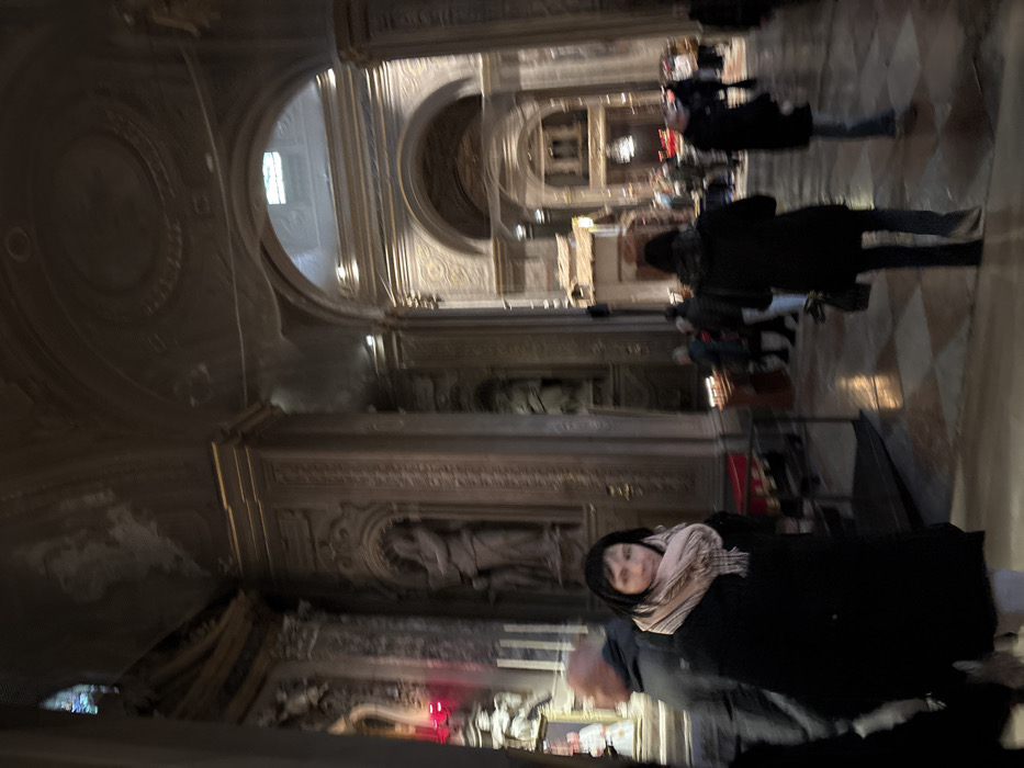 This image depicts the ornate interior of the Cattedrale di San Giorgio Martire (Ferrara Cathedral) in Ferrara, Italy. The scene shows a dimly lit, expansive religious space characterized by grand architecture. In the foreground, a woman with dark hair, wearing a dark coat and a light-colored plaid scarf, is positioned slightly to the left of the center, looking directly at the viewer with a neutral expression. To her left, partially obscured, is a bald man wearing a dark jacket, facing away from the camera. A dark metal barrier or railing is visible in the lower left. The midground and background reveal the cathedral's intricate details and other visitors. On the right midground, a woman with dark hair, wearing a dark coat, is seen from behind, walking away from the camera and carrying a dark handbag. Nearby, a stand holds multiple lit votive candles, with several individuals gathered around it. Further into the background, groups of people are dispersed throughout the large space, generally appearing to observe or move through the area. Architecturally, the interior features tall, ornate pilasters lining the walls, each adorned with sculpted niches housing statues of robed figures. High arches lead into deeper sections of the cathedral, showcasing more elaborate decorations and recessed areas. The vaulted ceiling is visible, featuring decorative medallions and intricate plasterwork. On the far left, a prominent red glow emanates from what appears to be an altar or shrine, near which a figure in white vestments is discernible. The floor is covered with patterned tiles, likely marble or stone. The overall environment suggests a quiet, contemplative atmosphere typical of a historic cathedral interior.