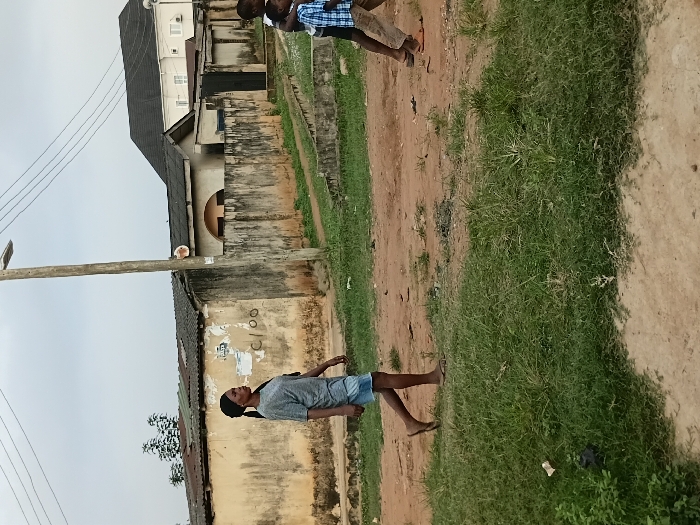 A young woman walks barefoot near a weathered building with peeling paint and a faded inscription. A light post stands nearby with power lines stretching across the sky. In the distance, two children are playing beside another building. The landscape is a mix of dirt and green vegetation. The sky appears overcast, contributing to a somewhat somber atmosphere.