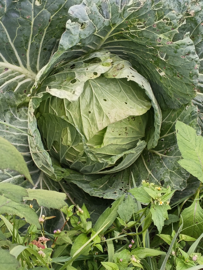 A close-up, overhead view depicts a single green cabbage plant in a field in Pinnwe, Myanmar (Burma). The cabbage's outer leaves are dark green, displaying numerous irregular perforations and some browning, consistent with insect damage. Prominent veins are visible across the leaves. The tightly packed inner leaves forming the head are lighter green and show fewer signs of damage. The cabbage is surrounded by various interspersed green plants, including weeds, some bearing small white, pink, or yellow flowers, particularly in the foreground and lower portions of the image. No people or animals are present.