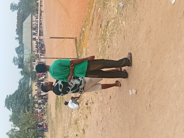 Two young men stand on a dirt field. One wears a green shirt and dark pants, the other a patterned shirt and light shorts. A volleyball net is visible in the background, along with a building and trees. A crowd of people is gathered near the building. The ground appears dry and dusty, with some scattered debris.