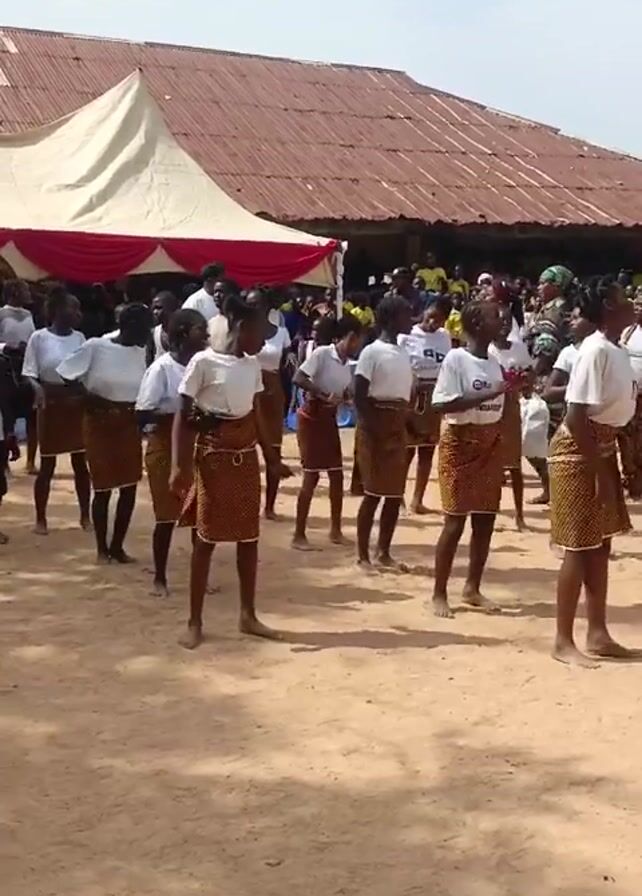 A group of about a dozen young women are dancing in a dirt field. They wear white shirts and patterned brown skirts. In the background are a group of spectators under a tent and a building with a rusted roof. The women move in sync, placing their hands on their hips and stepping side to side.