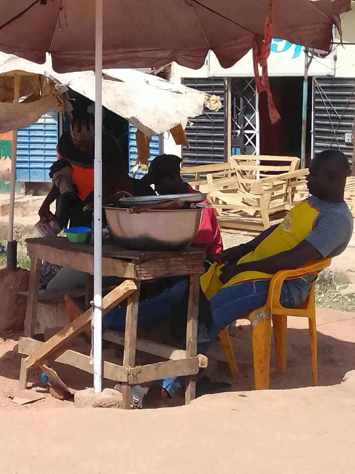 An outdoor scene in the city of Unknown, Unknown, depicts a makeshift street vendor stall on unpaved reddish-brown ground under direct sunlight. Overhead, a brown parasol and a worn white tarp provide shade, supported by a central white pole. This pole is secured near a crude wooden table where a large silver metal bowl filled with food is positioned. A smaller green plastic bowl and a blue plastic bowl are also on the table. Three individuals are visible. Behind the table, a person wearing a dark cap and a red garment is largely obscured by the large bowl and the pole, with their right arm reaching towards the bowl's contents. To their immediate left, another individual wearing an orange vest or top is partially visible, holding a light-colored container. Further left, a child with braided hair is faintly seen. To the right of the wooden table, an adult male with a shaved head sits relaxed on a yellow plastic chair. He wears a grey t-shirt and blue jeans, with a yellow apron draped over his lap and right shoulder, his gaze directed towards the left, possibly at the stall or the other individuals. In the background, a building features blue roll-down shutters, and further right, several unfinished wooden furniture frames, possibly chairs, are stacked.