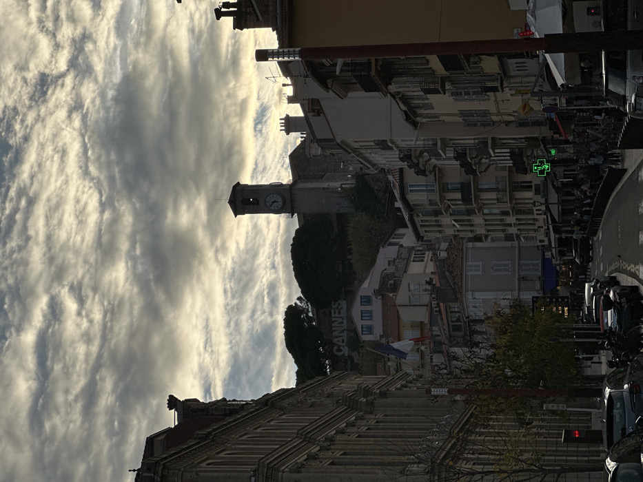 A cloudy sky looms over a coastal town. A clock tower stands on a small hill, surrounded by greenery. Below, various buildings line a narrow street, including one with "CANNES" displayed prominently. A French flag flies nearby. A pharmacy sign is visible amidst parked vehicles and pedestrians on the right side of the street. Architectural details are evident on buildings in the foreground.