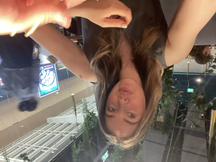 A person with long brown hair and blue eyes looks at the camera. The background shows a person reflected in the table surface and a building interior with greenery. The photo is taken from a low angle, and the top of the image is blurry. The person is wearing a gray top.