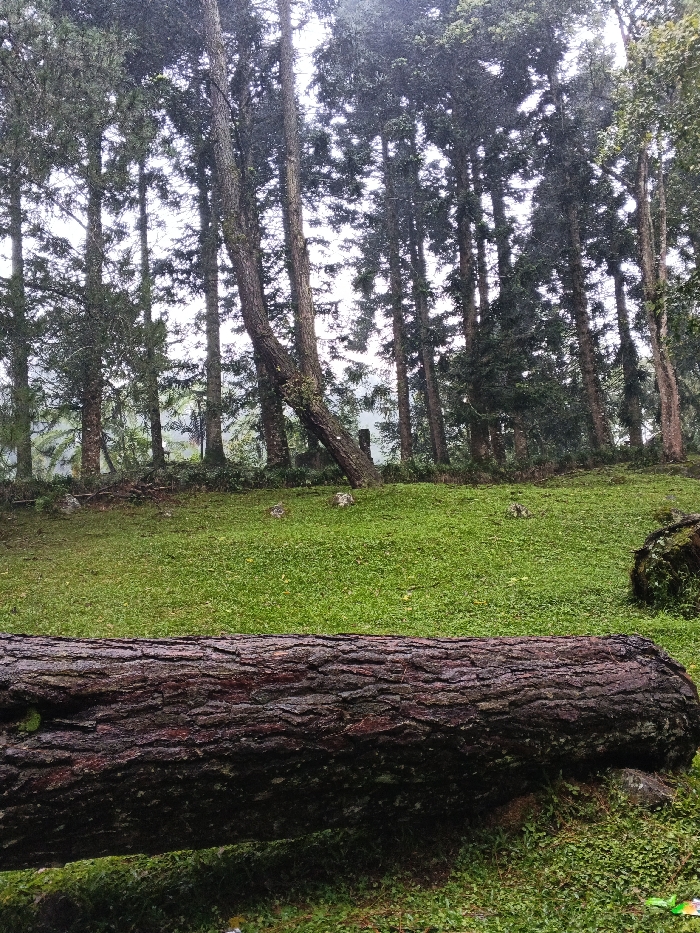 A serene forest scene unfolds with towering trees lining the background. Lush green grass covers the ground, meeting the trees at the treeline. In the foreground, a large, dark, textured log dominates the view, its surface appearing wet. The overall atmosphere suggests a peaceful, natural environment with a damp or rainy weather.