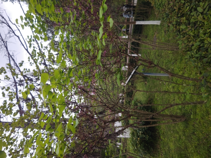 The image depicts an outdoor environment within the Chongqing High-tech Zone, China, under an overcast sky. In the immediate foreground, multiple slender-trunked deciduous trees with light green, nascent leaves and clusters of reddish-purple buds or small flowers are visible, rising from a dense expanse of green grass. Low-lying green shrubs are also present on the ground. The midground features a small, dark-colored solar panel mounted on a grey metallic pole, angled upward. Several vertical white-painted posts or tree trunks are scattered further back. A paved pathway is discernable in the background, where multiple indistinct human figures are partially visible, appearing to be walking or standing. The overall vegetation suggests late winter or early spring conditions.