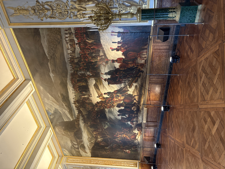 This image captures a grand interior space within the Palace of Versailles, France, specifically one of its historical galleries, such as the Salle du Sacre. The primary subject is a massive wall-mounted oil painting titled "Passage du Grand Saint-Bernard par l'Armée Française en Mai 1800," depicting Napoleon Bonaparte leading his army through the snow-covered Alps. The painting occupies the majority of the wall, featuring hundreds of soldiers on foot and horseback, navigating a winding path amidst towering, barren peaks under a muted sky. Napoleon, mounted on a rearing horse, is prominently positioned in the center-right, gesturing forward with his right arm, clad in a bicorn hat and military uniform. The troops are shown in various French military uniforms of the early 19th century, carrying muskets and flags, struggling against the harsh mountainous environment. Below the painting, a dark wooden wainscoting or paneling with a marble-like finish extends across the lower wall. A small informational sign in French is visible on this paneling. Several modern black spotlights are positioned on the floor to illuminate the artwork. A low, freestanding metal stanchion barrier separates the painting from the viewing area. To the right of the painting, the wall is adorned with ornate gilded bas-reliefs and sculptures, including figures, scrolls, and classical motifs. A large, multi-branched gilded candelabrum with unlit white candles, featuring a dark green marble-clad pedestal, stands prominently in the foreground on the right. The ceiling is high, featuring intricate white and gold moldings and coffers. The floor is covered in a highly polished, light brown wooden parquet, arranged in a complex geometric basketweave pattern. Ambient light illuminates the upper parts of the room, complementing the spotlights on the painting.