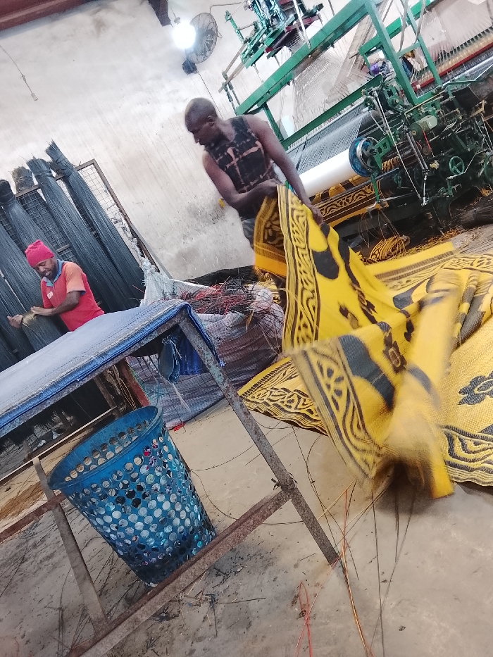 An indoor industrial workshop in an unknown city and country features two adult males engaged in manual labor. The environment consists of plain, light-colored walls and a bare concrete floor littered with various materials. To the left, one male subject, wearing a red beanie and an orange t-shirt, is seated or stooping behind a low, blue-topped metal frame. He is actively manipulating bundles of dark, thin rod-like material with both hands. Behind him, large bundles of similar material are stacked against a metal grid partition. To the right, a second male subject, with short hair and wearing a dark, patterned sleeveless shirt, stands and handles a large, yellow mat with black geometric patterns. The mat is partially unrolled on the floor, and he is in the process of unfurling or folding it. In the background, a large green industrial weaving loom is visible, with a white textile in production. A bare light bulb and a ceiling fan are mounted above the loom. Beneath the work frame, a blue, perforated plastic basket contains miscellaneous items. Scattered on the floor are various wires, strands, and debris.