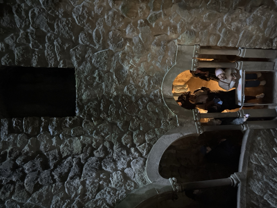 An unusual view of people in a stone structure, possibly a well or tower. The main wall is made of rough-hewn stones with a dark, recessed rectangular area on the left. To the right, a circular opening reveals people peering out, and a lower arched opening leads into deeper darkness. The overall lighting is dim, emphasizing the texture of the stone. The perspective gives the sense of looking up from below.
