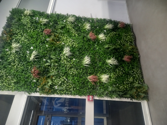 The scene depicts an interior view within a Decathlon store located in Vendin-le-Vieil, France. A large, artificial green wall, densely covered with varied faux foliage, dominates the central and right portions of the image. This vertical garden features numerous small green leaves, accented by clusters of spiky white-tipped and reddish-brown-tipped plants, scattered small white flower-like elements, and fern-like fronds. To the left, a glass door with a white frame is partially visible, reflecting the inverted text "DECATHLON" along with French phrases such as "Continuez l'aventure" and "explorez." A red fire alarm pull station is mounted on the white door frame adjacent to the green wall. The floor is a uniform, light grey, smooth surface. No individuals or discernible activities are present.