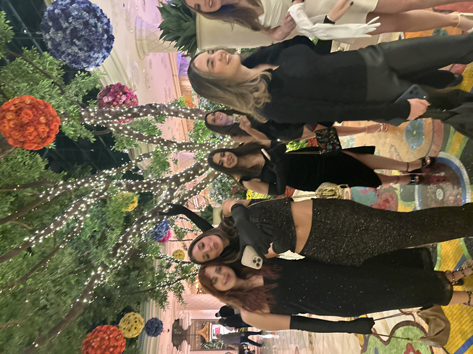 Six young women pose for a photo amidst a decorative indoor scene. They are dressed in formal attire. A tree adorned with small white lights and colorful floral spheres dominates the background. The architecture has an ornate, classic style. The women are arranged in a loose group, with some close to the camera and others slightly further away. The floor beneath them is patterned with a mosaic design.