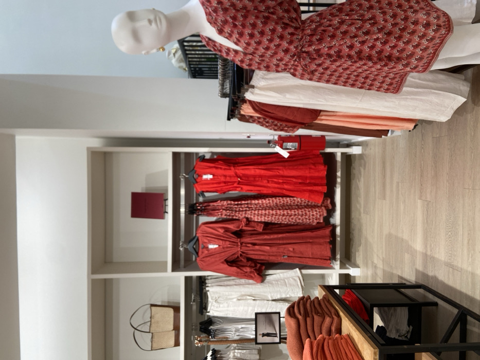 interior of a clothing store in Greenwich, Connecticut. The location's coordinates are latitude: 41.029, longitude: -73.626. The store is brightly lit and has white walls and wooden floors. Several racks of clothing are displayed, with a variety of dresses and other items for sale. One mannequin is on display wearing a red, printed dress with a white background. The mannequin's face is painted white. The other dresses on the rack are all red. There is a large wicker bag in the top shelf of the left-hand rack, which is also white. The space is organized, and many garments are on display. The clothes are displayed in a modern and stylish way, with a focus on color and texture. The image suggests a high-end clothing store that caters to a discerning clientele.