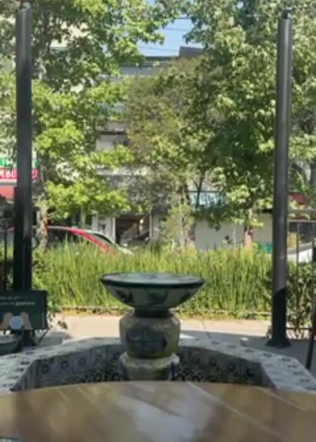 n ornate fountain at the center of a courtyard. The fountain consists of a ceramic bowl, painted with blue designs, resting on a similarly decorated pedestal. The fountain is surrounded by a low, tiled wall. Two black metal poles flank the fountain, and greenery grows behind it, obscuring parts of nearby buildings. The scene is shot from the perspective of someone sitting at a wooden table. The sky is clear and blue.