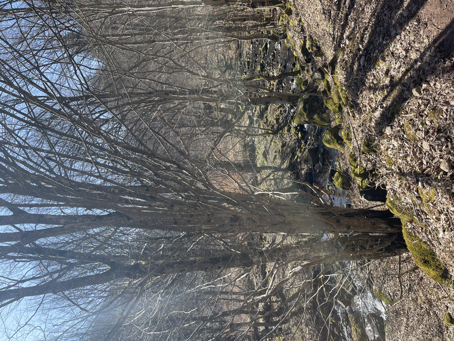 The image depicts a deciduous forest scene in Lesidren, Bulgaria, under clear daytime conditions. A rocky stream flows from the mid-right towards the lower-left, bordered by a dense concentration of bare trees. The ground in the foreground and midground is covered with dry, fallen leaves, small rocks, and patches of vibrant green moss, particularly prevalent on stones within and adjacent to the stream. Strong sunlight from the upper left casts distinct, elongated shadows across the leaf-covered ground, suggesting a low sun angle. Numerous trees with bare, intricate branches dominate the frame, their grey-brown bark visible. No individuals, animals, or artificial structures are present. The sky, visible through the sparse canopy, is clear blue.