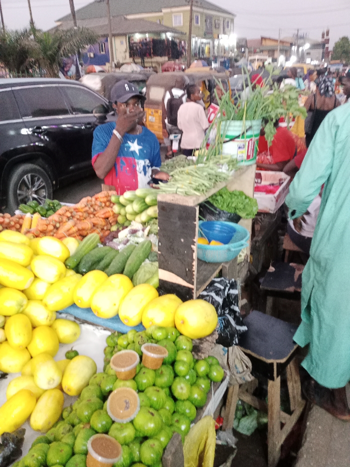 A vibrant outdoor market scene unfolds. A vendor in a baseball cap and Texas-themed shirt stands behind a display brimming with colorful produce: yellow gourds, green cucumbers, carrots, tomatoes, long beans, and leafy greens. A black SUV is parked to the left of the stand. Additional people and vehicles are visible in the background, creating a bustling atmosphere.