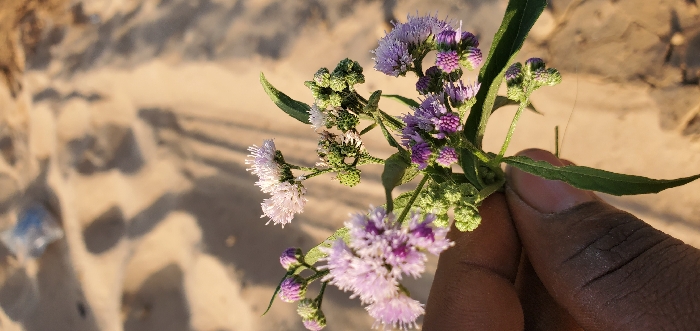 A hand holds a bunch of purple and white flowers with green buds and leaves. The blooms have a feathery, thistle-like appearance. The background features a sandy expanse, possibly a beach or desert, with soft shadows. The light is bright, illuminating the texture of the sand and the delicate details of the flowers. A piece of litter lies discarded in the background.