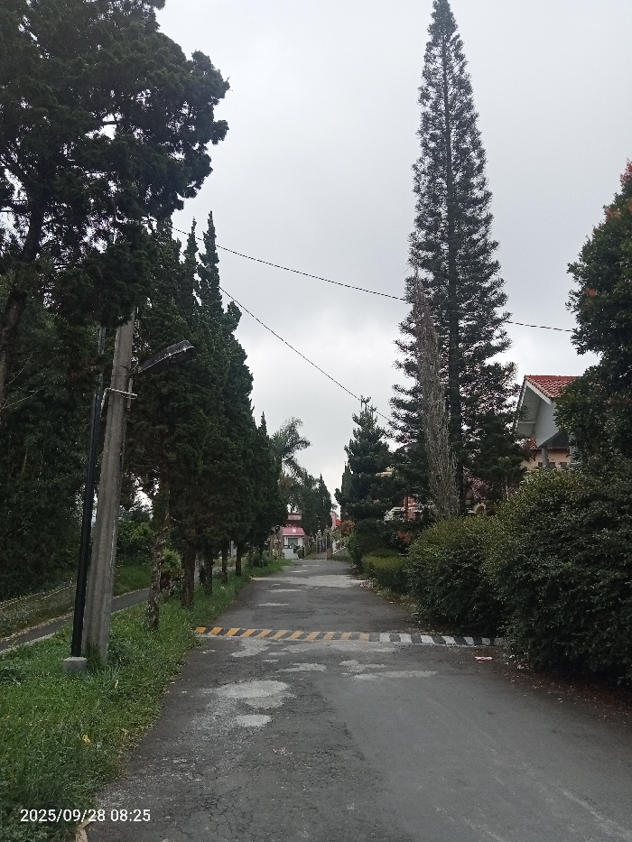 An outdoor, eye-level street scene in Waso ward, Kenya, captured on 2025/09/28 at 08:25 under an overcast sky. The image depicts a narrow, dark asphalt road, showing signs of wear and light-colored patches, leading into the distance. A black and yellow striped speed bump or rumble strip traverses the road in the foreground. On the left side of the road, a grey utility pole with a street light fixture stands upright. Beyond the pole, a line of tall, dark green coniferous trees borders the road, with dense vegetation further behind. On the right side, a manicured green hedge and several coniferous trees, including one exceptionally tall, slender conifer reaching high into the frame, line the road. Behind the vegetation on the right, the red-tiled roof and white-painted eaves of a residential building are partially visible. In the mid-ground, the road continues, flanked by more trees and glimpses of residential structures with light-colored walls and red roofs. Overhead, dark electrical wires span across the upper portion of the frame. No individuals, animals, or vehicles are present.