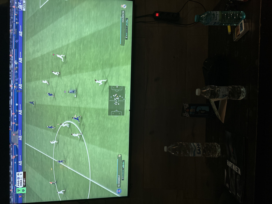 The image displays an indoor scene, likely within a gaming lounge, bar, or private entertainment area located in Sofia, Bulgaria. A large, wall-mounted television screen, centrally positioned, shows a football video game. The game depicts a match between PSG and RMA with a score of 0-1 at 17:41 in-game time, featuring players like "10 DEMBÉLÉ" and "HUISEN 24" on a green pitch. Below the television, a dark wooden table is present, set against a dark wooden plank wall. On the table, arranged from left to right, are: a dark magazine or menu with "МАРКЕТА" visible on its cover; a clear plastic bottle of Bankya mineral water; a small, upright promotional item partially displaying "SOFIA GOOD TIME"; another clear plastic water bottle; a clear plastic bottle of Velingrad mineral water; a gold-colored cigarette pack; and a yellow lighter. To the right of the table, a black power strip with a visible red indicator light is mounted on the wall, with multiple cables plugged in. The scene is dimly lit, with the television screen being the primary light source. The presence of Bulgarian mineral water brands (Bankya, Velingrad) and the "SOFIA GOOD TIME" sign confirms the location as Sofia, Bulgaria.