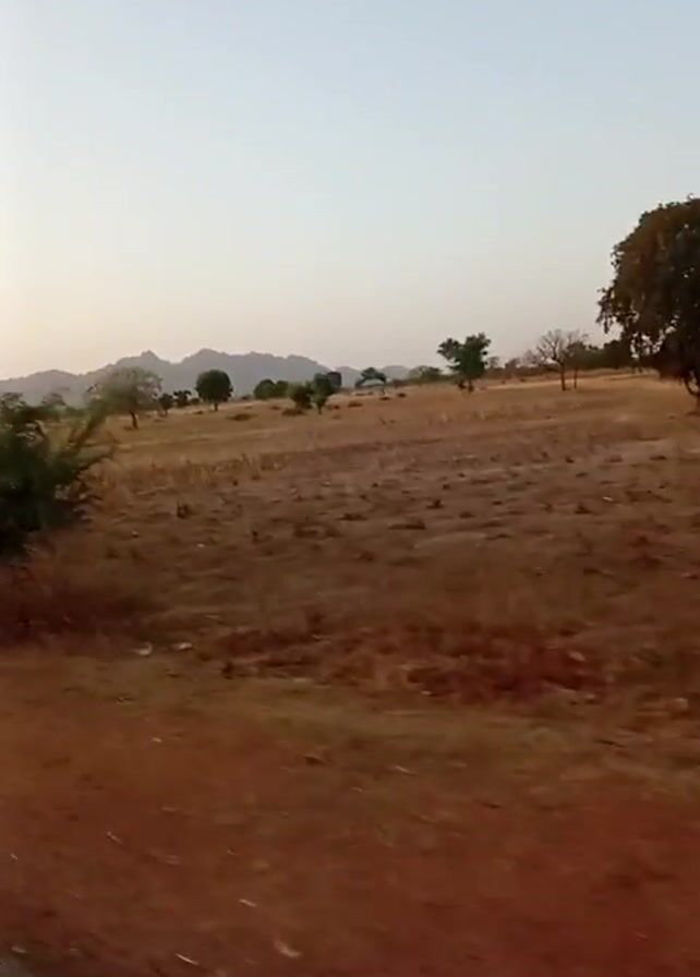 The video depicts a landscape as seen from a moving vehicle. The ground is primarily dry, reddish-brown soil, sparsely covered with dried grasses and scattered trees. In the distance, low mountains are visible against a light-colored sky. The video footage is shaky, suggesting it was taken from a moving vehicle. The overall impression is of a dry, rural area, possibly during the dry season.