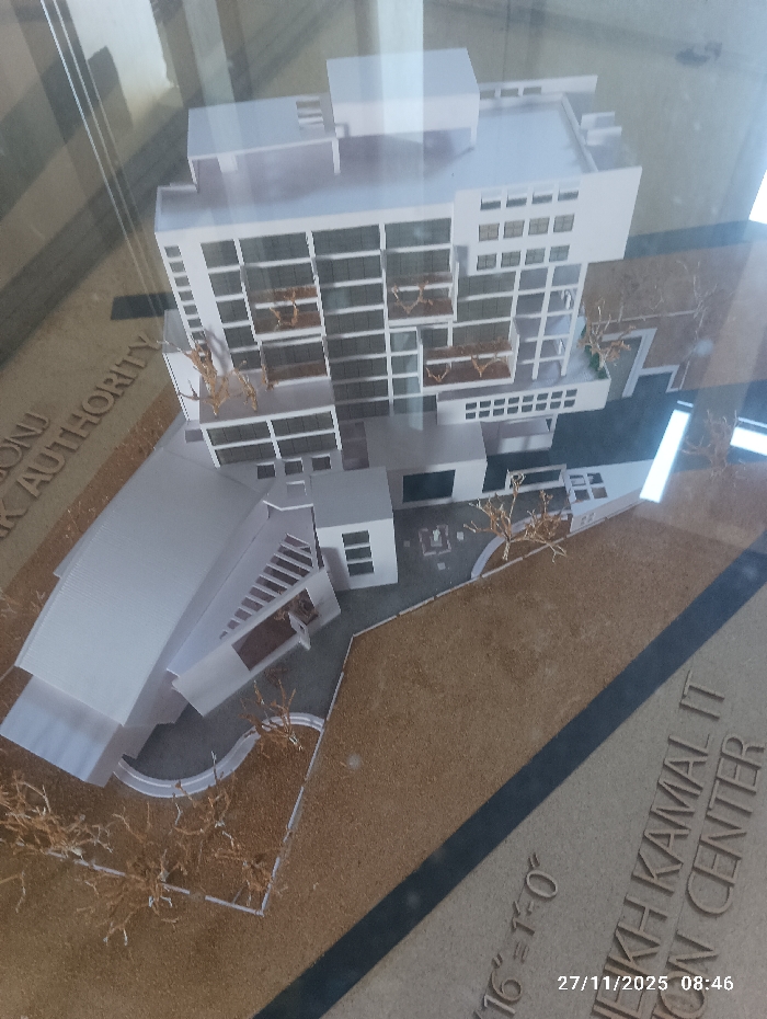 A building model under glass showcases architectural designs. A multi-story structure with numerous windows is connected to a smaller, modern-style building with a sloping roof. Miniature trees adorn the landscape around the buildings. Text on the base identifies it as "SHEIKH KAMAL IT INNOVATION CENTER". A scale of "1/16" = 1'-0"" is visible alongside the date "27/11/2025 08:46".