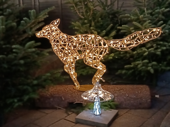 - "An outdoor holiday display shows a golden fox figurine made of connected metal and small lights posed in mid-stride, perched atop a rough-hewn log" by FM-rFWs12, licensed under CC BY 4.0