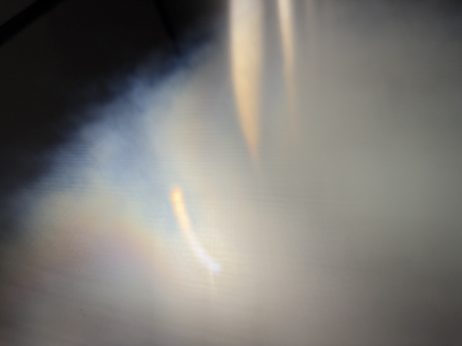 The image is abstract and mostly out of focus. There's a dark, indistinct area in the top left. The main part of the image is filled with blurred light, with a hazy white and gray background. A bright, curved streak of light, tinged with orange and blue, arcs across the image. Vertical streaks of golden light are also visible, further blurring the scene. Overall, the image lacks clear definition and relies on light and color gradients.