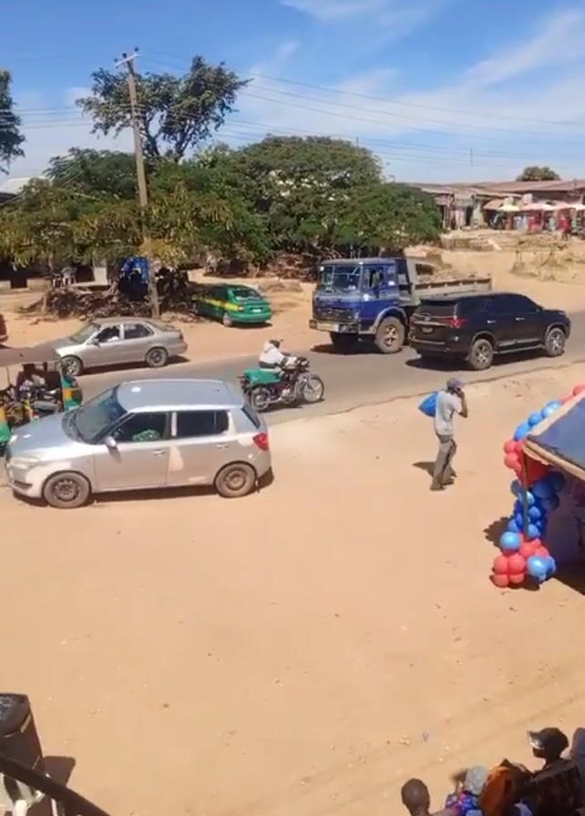 daytime street scene from an elevated perspective. Various vehicles, including cars, a pickup truck, and a blue truck carrying a load of rocks, are driving along a paved road. A person is walking along the road's edge. People are sitting under a tan-colored canopy decorated with red and blue balloons. The environment appears to be a commercial or residential area with buildings and trees visible.