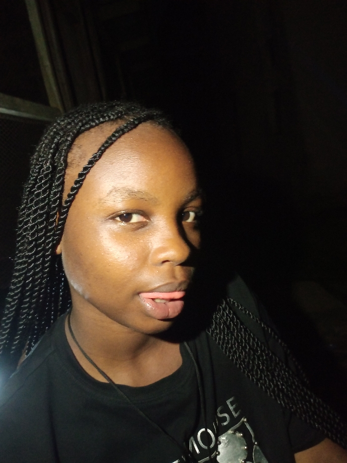 A young woman poses for a selfie, sticking her tongue out slightly. She has dark skin, brown eyes, and dark braided hair. She wears a black t-shirt with white lettering. The background is dark, possibly indoors, with a hint of what appears to be a window or screen on the left. The lighting is dim, casting shadows on her face. She wears a necklace.