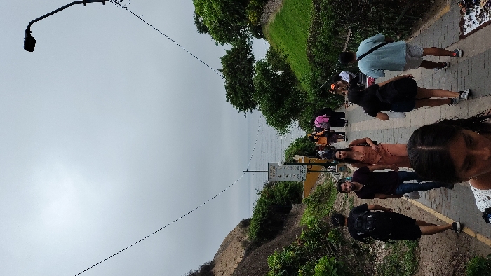 The image depicts a descending paved pedestrian walkway, likely the Bajada de Baños, in Barranco, Peru, leading towards the Pacific Ocean under an overcast sky. The path is flanked by natural, vegetated slopes; a steep, earthy bank with sparse greenery on the left, and a more cultivated, grassy slope with trees on the right. Approximately a dozen individuals are present on the path, primarily moving downhill. In the immediate foreground, the top of a person's head and shoulders are visible. In the mid-ground, five individuals are walking down: a male in a black t-shirt and shorts with a black backpack, a male in a dark polo shirt and jeans carrying a white bag, a female in a light-colored sleeveless jumpsuit, a female in a black t-shirt and dark shorts with a black backpack, and a male in a light blue t-shirt and light shorts with a dark strap across his chest. Further down the path, a larger group of less distinct individuals is visible, some wearing bright clothing. In the upper right, a black streetlamp with a single light fixture extends upwards. Thin black cables traverse the sky from the top left to the mid-right. A tall, light-colored signpost with multiple informational panels is positioned on the left side of the path, further downhill, partially obscured by foliage. A section of a yellow building is visible behind the greenery on the left side of the path. Near the bottom right, on the edge of the walkway, there is a small display of items on a white surface, possibly offered by a vendor. The ocean occupies the horizon, appearing calm and grey under the cloudy sky.