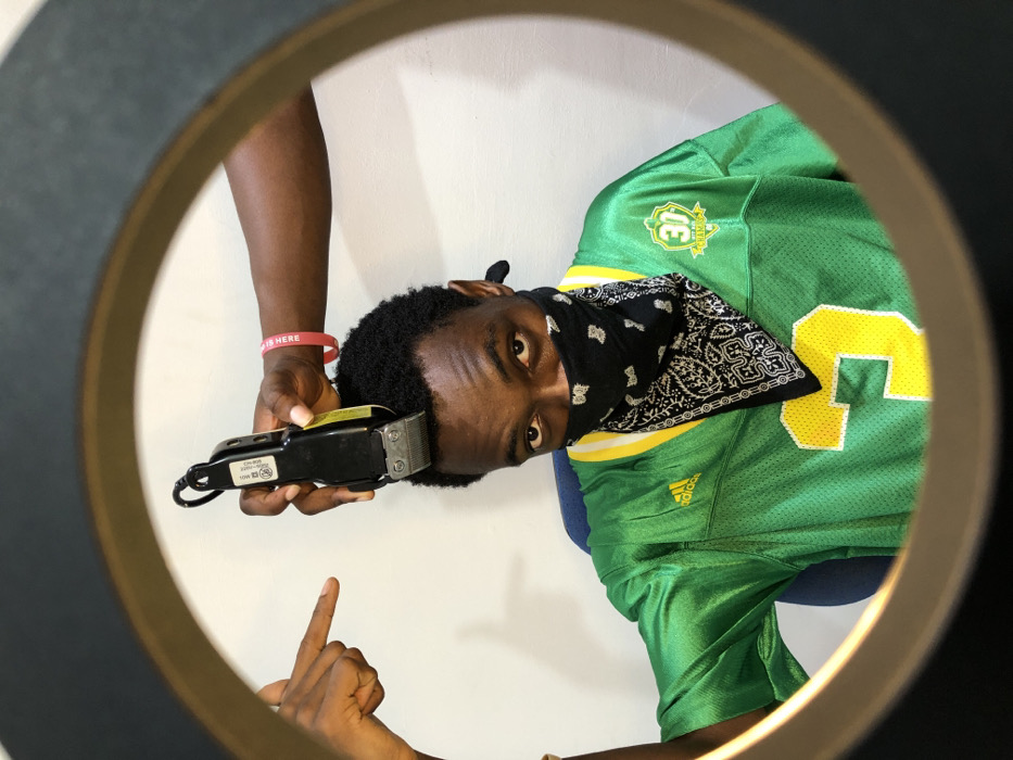 Within a light-colored indoor environment in Tomefa, Ghana, a young adult male is seated, facing the viewer, partially obscured by a circular frame. He wears a green Adidas sports jersey with a yellow number "3" and a "30 CHAMPIONS" patch, and a black bandana with white paisley patterns covering his nose and mouth. His dark, curly hair is visible. His left index finger points upwards towards the crown of his head. A second individual, whose dark-skinned right arm and hand are visible entering from the upper right, holds a black electric hair clipper (Wahl Professional model) against the first subject's scalp, indicative of a haircut in progress. The second individual's arm also bears a red wristband with the partial text "IS HERE." A portion of a blue chair back is visible behind the primary subject. The scene is evenly lit.