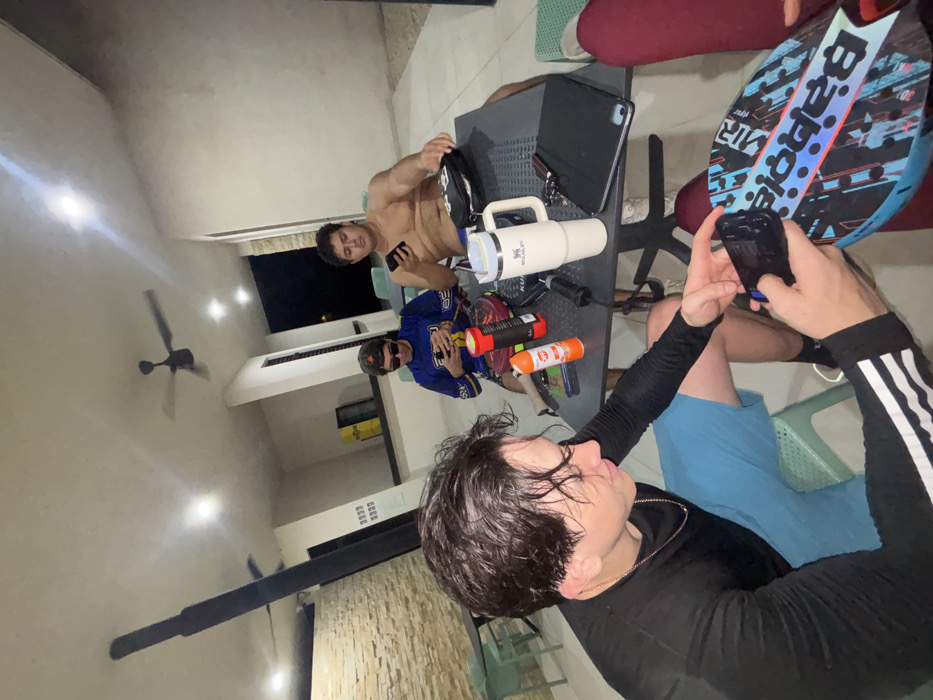 The image displays three males seated around a black square table at night, under a covered patio structure in Komchén, Mexico. The ceiling is illuminated by several recessed lights and features a dark ceiling fan, with a tall, angled black structure visible on the far left. Walls consist of smooth concrete and sections of light-colored stacked stone veneer. The environment outside the patio is dark, indicating nighttime, with a yellow bin visible in the distant background. In the foreground, a male with dark, wet hair wears a black long-sleeved shirt with white Adidas stripes on the sleeves and light blue shorts. He holds a black smartphone in his left hand and a blue and black Babolat paddle in his right, appearing to adjust or interact with the phone and paddle. Seated across the table, a male wears a blue long-sleeved athletic shirt with the number "22," sunglasses, and a camouflage baseball cap worn backward. He is focused on a black smartphone. To his right, a shirtless male in light-colored shorts is also looking down at a black smartphone. On the black table, from left to right, are an orange aerosol can, a black and red flashlight, a black device connected by a wire, a white Stanley travel mug with a handle, keys, a black pouch, and a black tablet or laptop in a case. All three individuals are engaged with their respective smartphones in this illuminated, semi-outdoor setting.