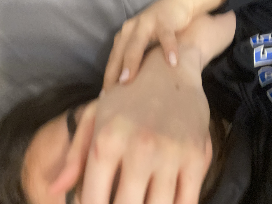 A person lies partially visible, their face partly obscured by a hand. Long, dark hair is visible near the face. One hand covers much of the image, revealing fingers with pale pink nails. A light-colored garment is beneath the person. To the right, a dark garment with a blue and white graphic element is present. A mole is visible on the back of the hand. The image is slightly out of focus.