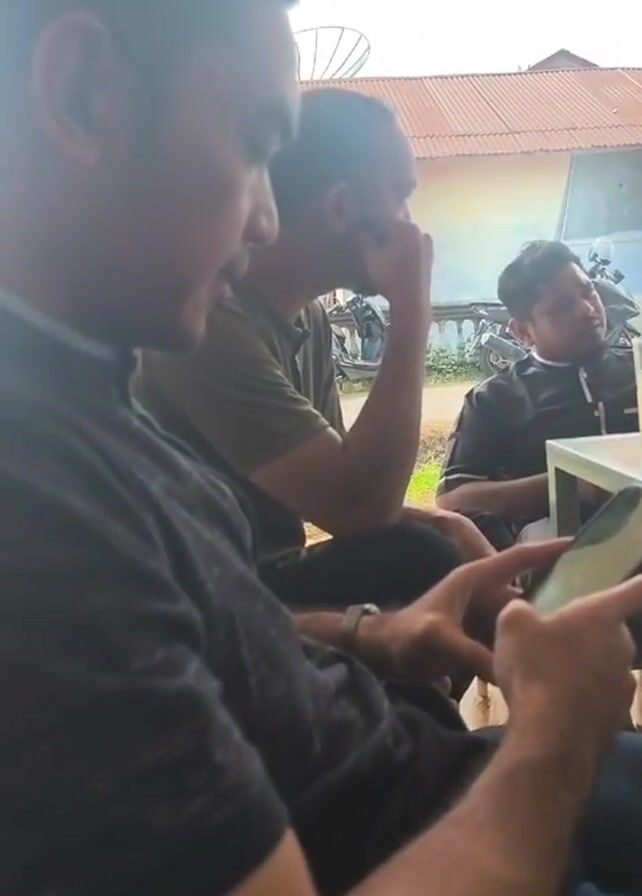 Three men are seated around a small, square white table on a covered patio. One man is focused on his cell phone while the others seem engaged in conversation. The table has several drinks and saucers on it. Through the window, three children in school uniforms are walking by. Motorcycles are parked in the background. The setting appears to be a casual outdoor cafe in a residential area.