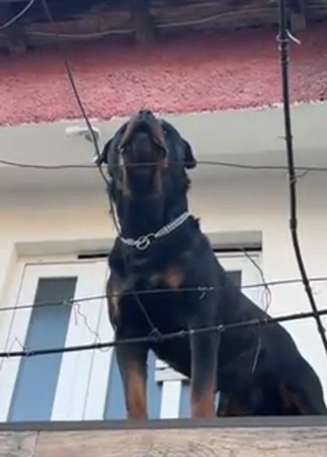 Rottweiler dog on a platform. The dog is mostly black with brown markings on its legs and face. It wears a silver-colored chain around its neck. The dog is looking up and howling. Behind the dog is a white building with a window and a red-colored roof overhang. There are also some wires and hardware running along the roof. The perspective is from below, looking up at the dog. The sky is visible in the background.