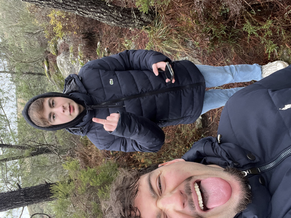 This image captures two males in a natural, overgrown outdoor environment within Ribeira de Pena, Portugal. In the foreground, an adult male with dark, wavy hair, a mustache, and a short beard, is seen in a close-up selfie orientation. He wears a dark blue puffer jacket featuring a white polo player logo and is depicted with a playful expression, his eyes squinted, mouth open wide, and tongue extended. Behind and to the right of the foreground subject stands a younger male, likely an adolescent or young adult, with light brown hair. This individual wears a dark blue hooded puffer jacket with a green crocodile logo (Lacoste), light blue jeans, and white sneakers. His right hand is raised, with the middle finger extended towards the camera, while his left hand holds a black smartphone. The surrounding environment consists of sparse trees with dark trunks, dense undergrowth of brown and green shrubs, and scattered grey rocks, consistent with a rural, vegetated landscape under an overcast sky.