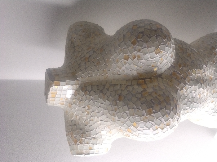 A mosaic sculpture of a woman's torso dominates the frame. Small, square tiles in varying shades of white and gold create a textured surface, highlighting the curves of the breasts, abdomen, and hips. The sculpture appears to be mounted on a plain white surface. Light reflects off the tiles, creating subtle gradations in tone and accentuating the three-dimensional form.