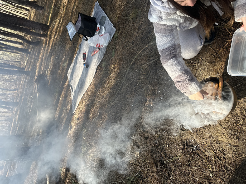 The image depicts an outdoor barbecue scene in a forest within the city of Shkorpilovtsi, Bulgaria