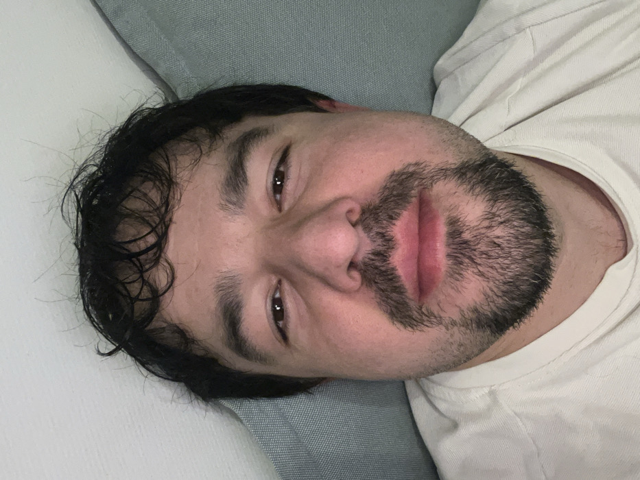 - "A man with dark hair and a beard is lying on a white and grey surface" by FM-W2ag82, licensed under CC BY 4.0
