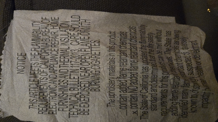 The image displays a close-up, slightly grainy photograph of a white, crumpled fabric tag with black printed text. The tag is rectangular, approximately 80% visible, and appears to be sewn or attached to a dark, indistinct fabric background, possibly upholstery. The text on the tag is titled "NOTICE" and states: "THIS ARTICLE MEETS THE FLAMMABILITY REQUIREMENTS OF CALIFORNIA BUREAU OF ELECTRONIC AND APPLIANCE REPAIR, HOME FURNISHINGS AND THERMAL INSULATION TECHNICAL BULLETIN 117-2013. CARE SHOULD BE EXERCISED NEAR OPEN FLAME OR WITH BURNING CIGARETTES." Below this, a checked box with an 'X' indicates the product's upholstery materials "contain NO added flame retardant chemicals." The subsequent text explains: "The State of California has updated the flammability standard and determined that the fire safety requirements for this product can be met without adding flame retardant chemicals. The State has identified many flame retardant chemicals as being known to, or strongly suspected of, adversely impacting human health or development." No individuals, actions, or specific interactions are depicted. The scene is static, focused solely on the informational tag. The environment appears to be an indoor setting, likely associated with furniture or an appliance. The image does not contain any visual information to confirm a specific city location, such as Lompoc, United States, beyond the general reference to the "State of California" in the text.