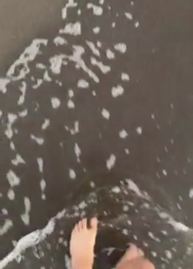 A person walks barefoot on a dark, sandy beach. Their feet are visible along with the lower part of their legs and teal-colored shorts. The legs are somewhat hairy. Small waves wash over the sand around their feet, leaving a trail of foam. The camera is positioned to show a first-person point of view.