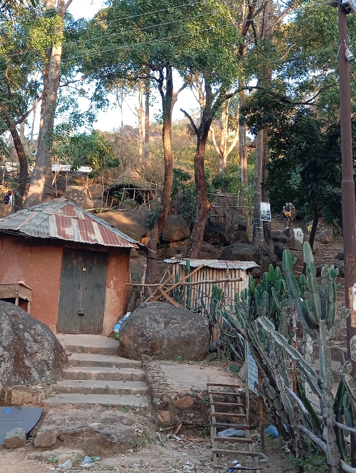 The image displays a rocky, tree-covered hillside scene in Jos, Nigeria, featuring a combination of natural elements and human-made structures. In the left foreground, an earth-toned building with a rusted corrugated metal roof and a dark, weathered wooden door is visible. A series of rough-hewn stone steps leads up to this building, with a large natural boulder positioned to the left of the stairs. To the right of the steps, a cluster of tall, multi-branched cactus plants dominates the immediate foreground. Adjacent to the cacti, a small wooden sign with text is partially obscured, and a crude wooden ladder-like structure lies horizontally on the ground. Various pieces of debris, including plastic bags, are scattered across the earthen ground in the foreground. In the mid-ground, further up the slope, additional structures are present. These include a small, open-sided shelter with a light-colored roof, supported by wooden poles, and another structure with a wall constructed from bamboo slats. More stone steps and earthen paths ascend the hillside, navigating around large natural boulders and dense vegetation. A single individual, dressed in light-colored clothing, is observed walking uphill on a path in the mid-right portion of the image. Another partially obscured figure is visible in the far-left mid-ground, near a structure. The background is characterized by numerous tall trees with green foliage, creating a dense canopy that partially obscures the bright sky. Electrical wires are strung horizontally across the upper portion of the image, intertwining with the tree branches. A utility pole is partially visible on the far right. The scene is illuminated by natural sunlight, casting some shadows.