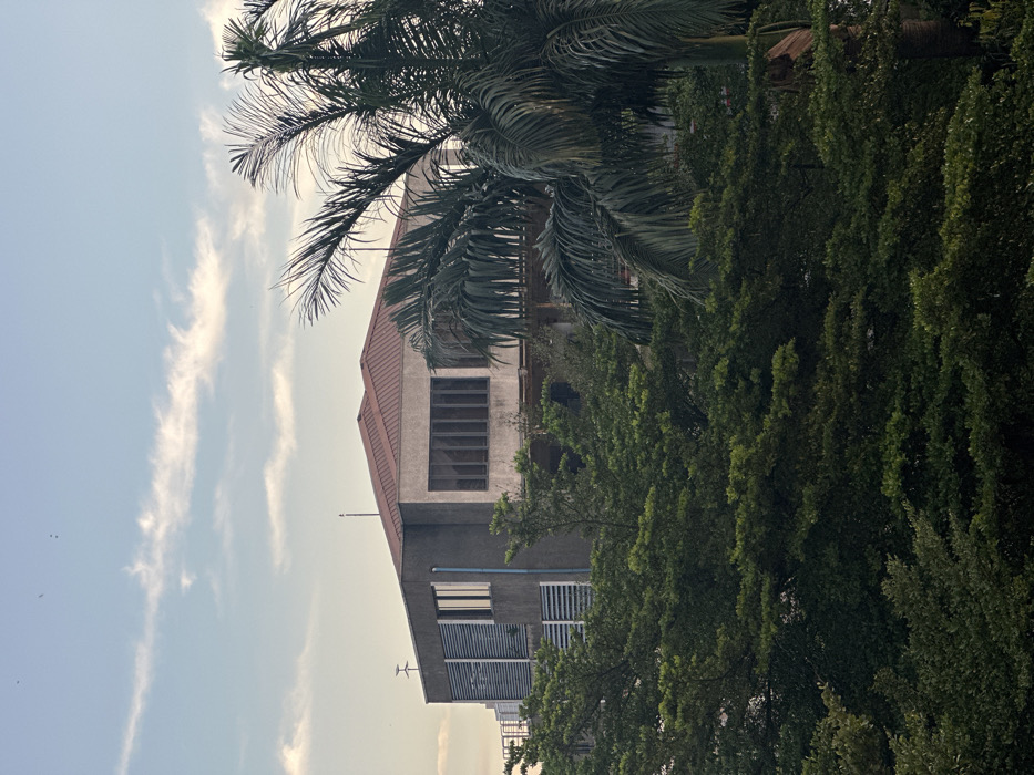 The image depicts a multi-story building set against a partly cloudy, light blue sky in Abuja, Nigeria. The structure features light grey-brown walls and a red-brown gabled roof. Its upper level includes a broad section of vertical windows on the right, and two sets of horizontal louvered panels with interspersed windows on the left, where a blue downspout is also visible. An antenna extends from a flat roof section on the building's left. Dense green foliage, including a prominent palm tree on the right, occupies the foreground and midground, largely obscuring the building's lower sections. No human activity or identifiable individuals are present.