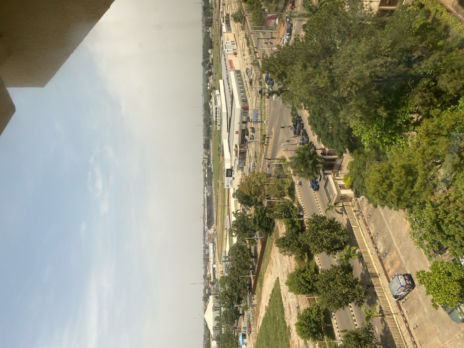 An aerial view captures an urban landscape in Shaba, Nigeria, under a hazy, light blue sky with sparse clouds. The scene is observed from a high vantage point, with a building structure partially visible at the top right of the frame. In the midground, a prominent multi-lane asphalt road with multiple vehicles, both moving and parked, snakes through the area. A significant intersection or roundabout is visible. To the right of the road, a large commercial complex with white and gray facades houses businesses such as "ShopRite," "Game," and "PEP," surrounded by extensive parking lots containing numerous parked cars. On the left side of the midground, a large, undeveloped plot of reddish-brown earth and sparse vegetation is visible. Adjacent to the roads and within landscaped medians are numerous green trees of varying sizes. A small, light-colored guardhouse structure is positioned near a parking area in the lower left. In the background, a large stadium with visible spectator stands and a dirt field is present to the left of center. Further left, a distinctive white building with a peaked roof stands out. The horizon is dotted with numerous other buildings and several communication towers, fading into the atmospheric haze. No specific individuals or discernible interactions are visible due to the elevated perspective and distance.